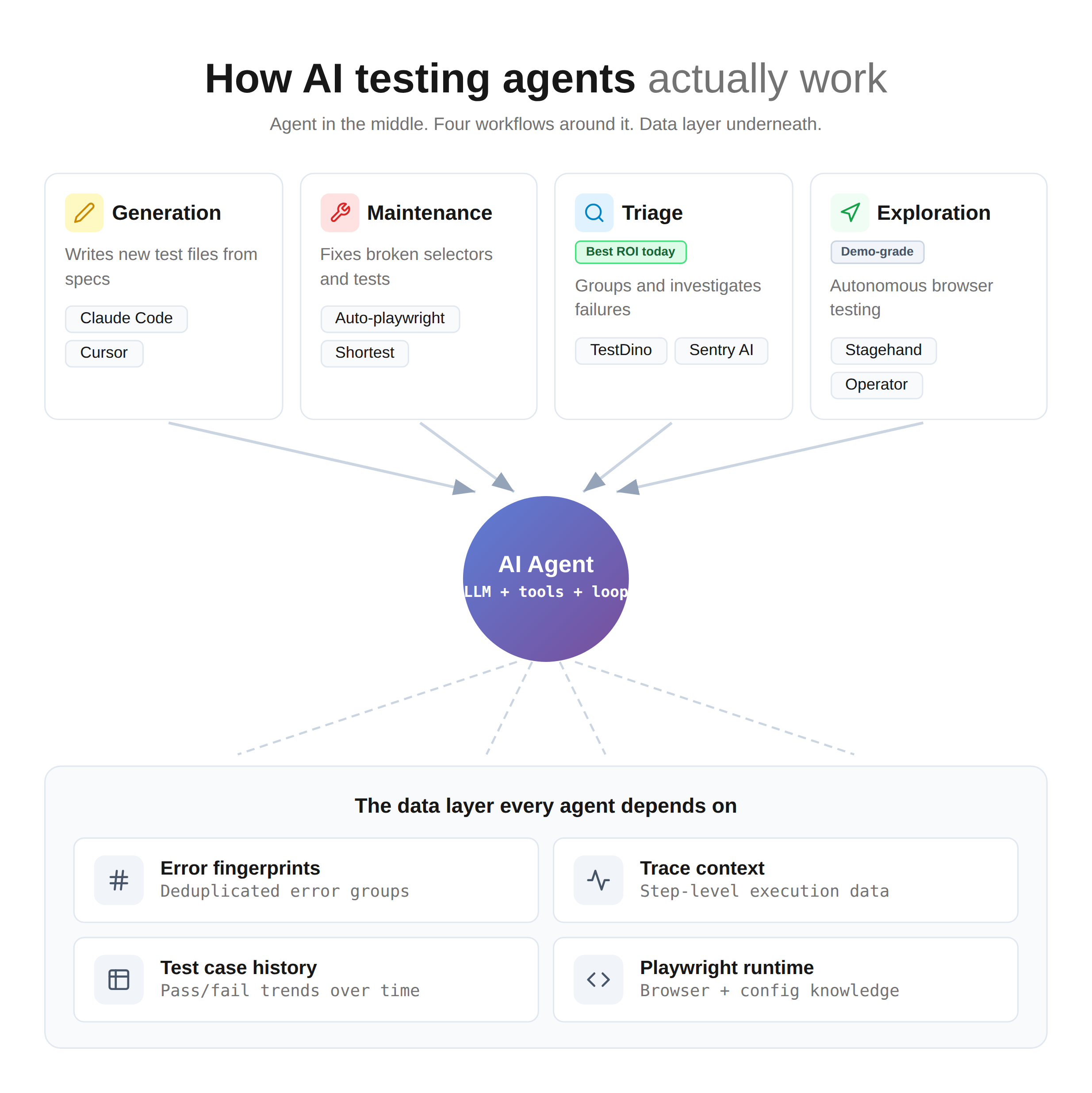 | Triage | TestDino, Sentry AI, custom LLMs | Grouped errors, trace, test history | Investigation brief, labels | Post-CI run | Ready today |