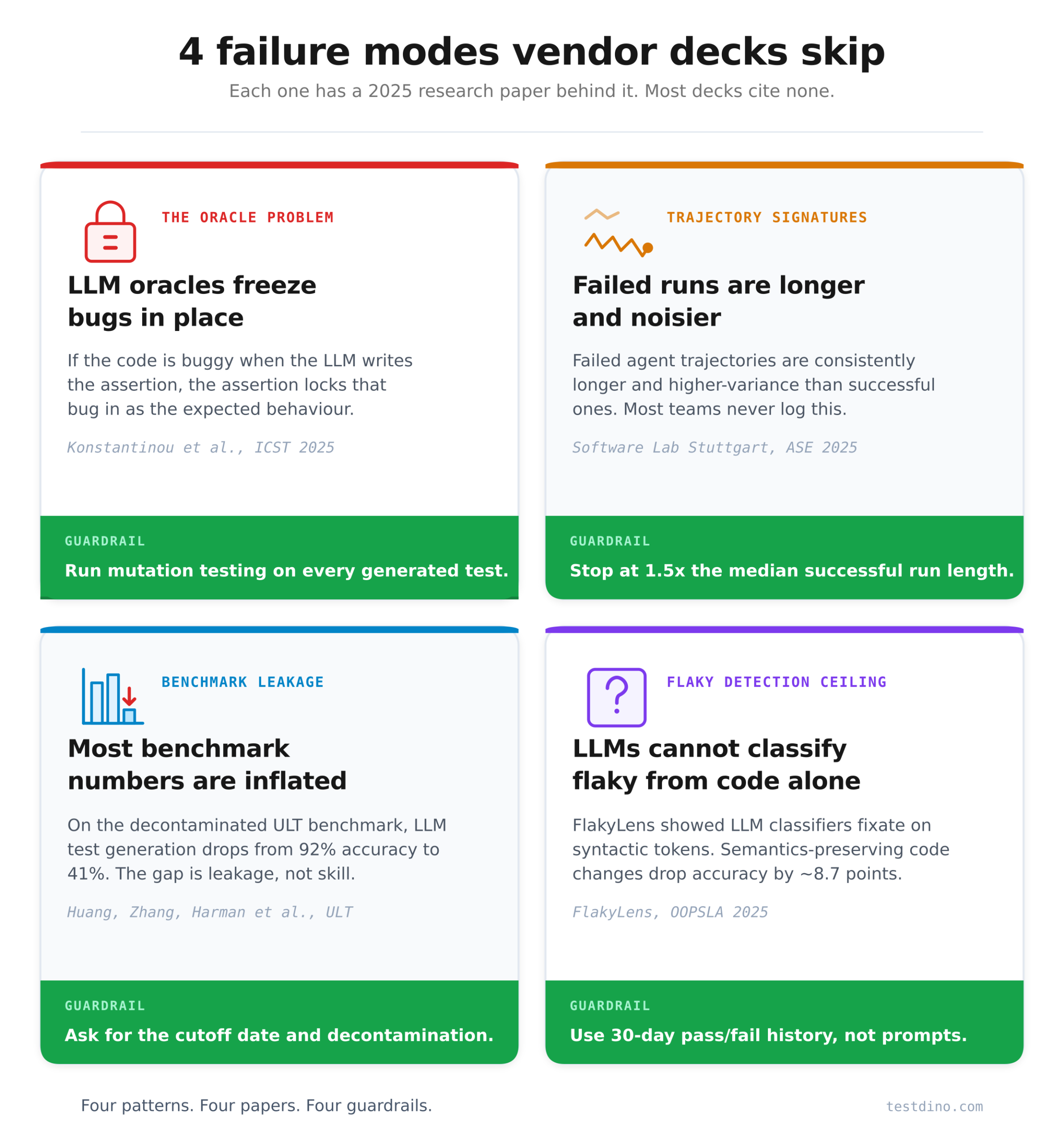 Guardrail: When a vendor quotes a benchmark number, ask three questions. What's the cutoff date of the benchmark? How was contamination controlled? Are they reporting branch coverage or just line coverage, and is the mutation score included? If any answer is hand-wavy, discount the number heavily.