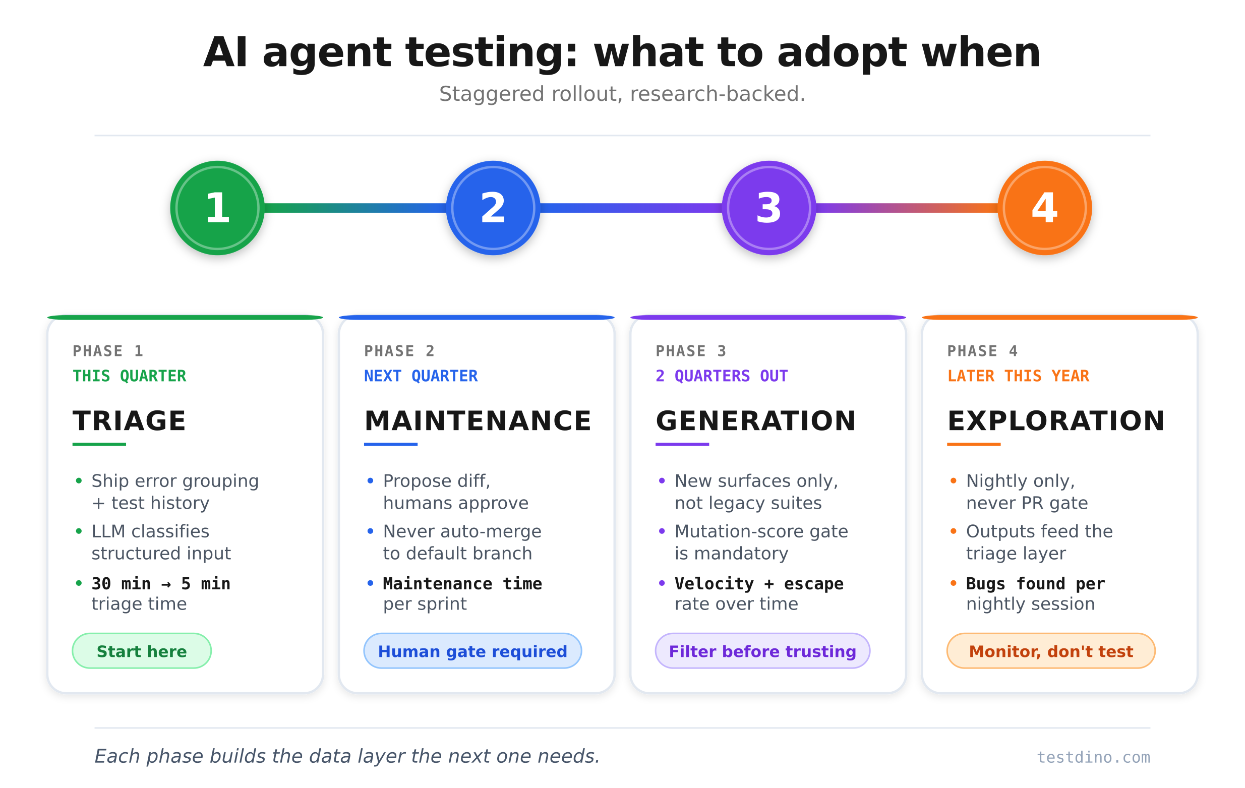 Triage agents are the lowest-risk, fastest-ROI option for almost every team. The bottleneck is the data layer, not the LLM. Ship the substrate first: error grouping, trace context, test history. Wire an LLM on top of that structured input. Measure triage time per failure before and after. Most teams see a drop from 30 minutes to under 5 minutes on recurrent failure classes.
