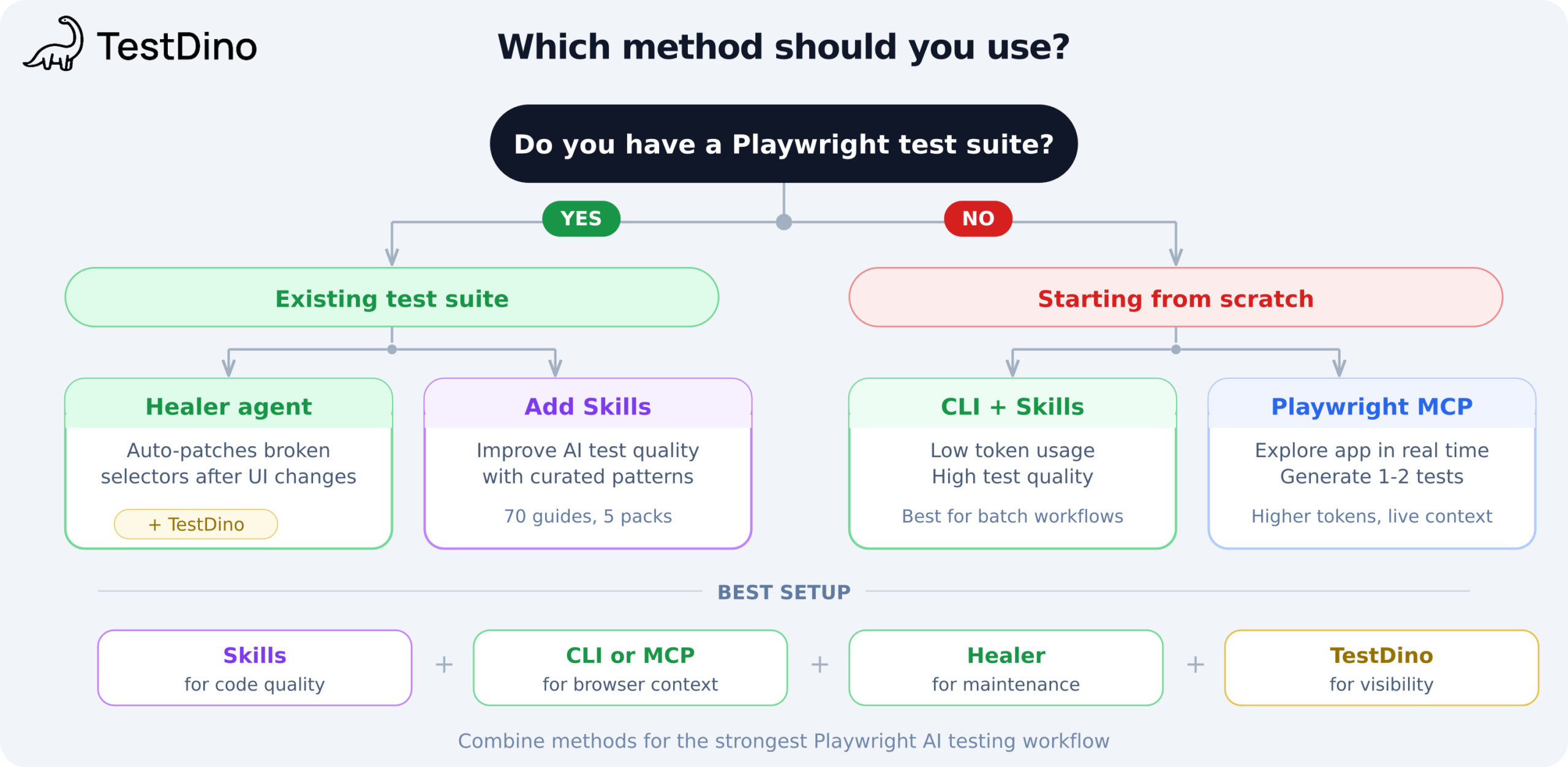 Now that you've seen all 5 methods, here's how to choose between them. The best AI tool for Playwright tests depends on where you are today. Walk through these questions:
