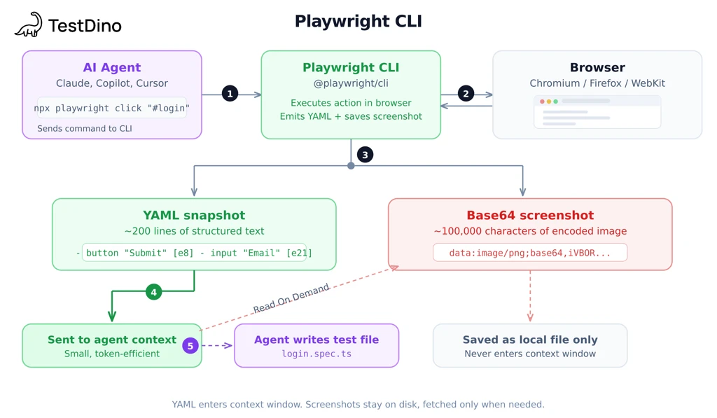 Why that matters: imagine an e-commerce page with 40 products, each with an image, title, price, and rating. With CLI, that page state can live in YAML outside the conversation, so the agent can pull what it needs and move on. That keeps long multi-page sessions more manageable.