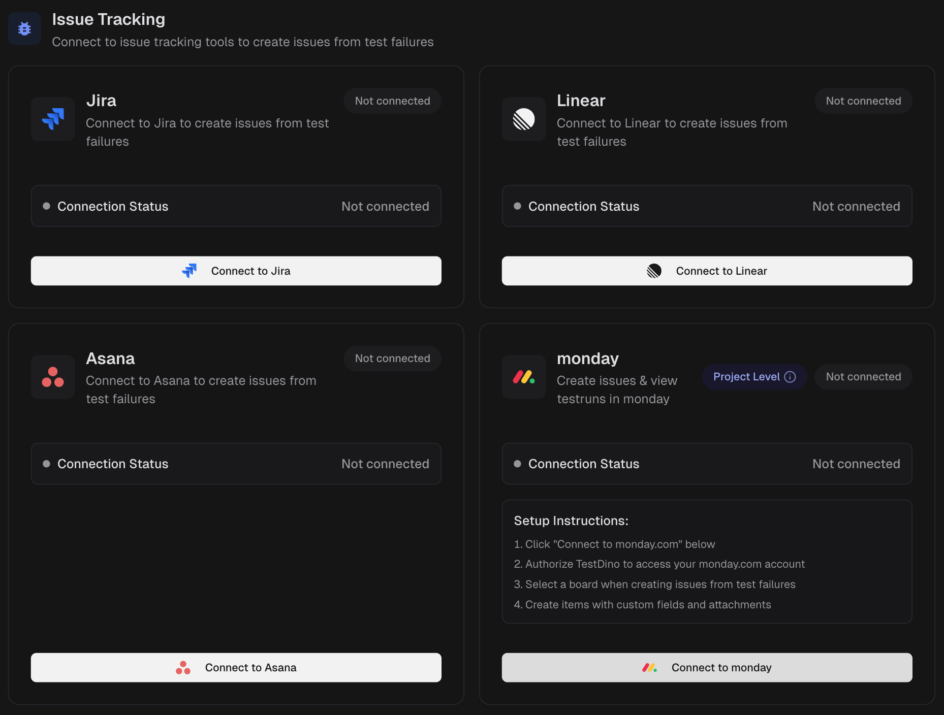 - Create Jira, Linear, Asana, or monday issues prefilled with test details, failure cluster, code snippet, short history, and links.
