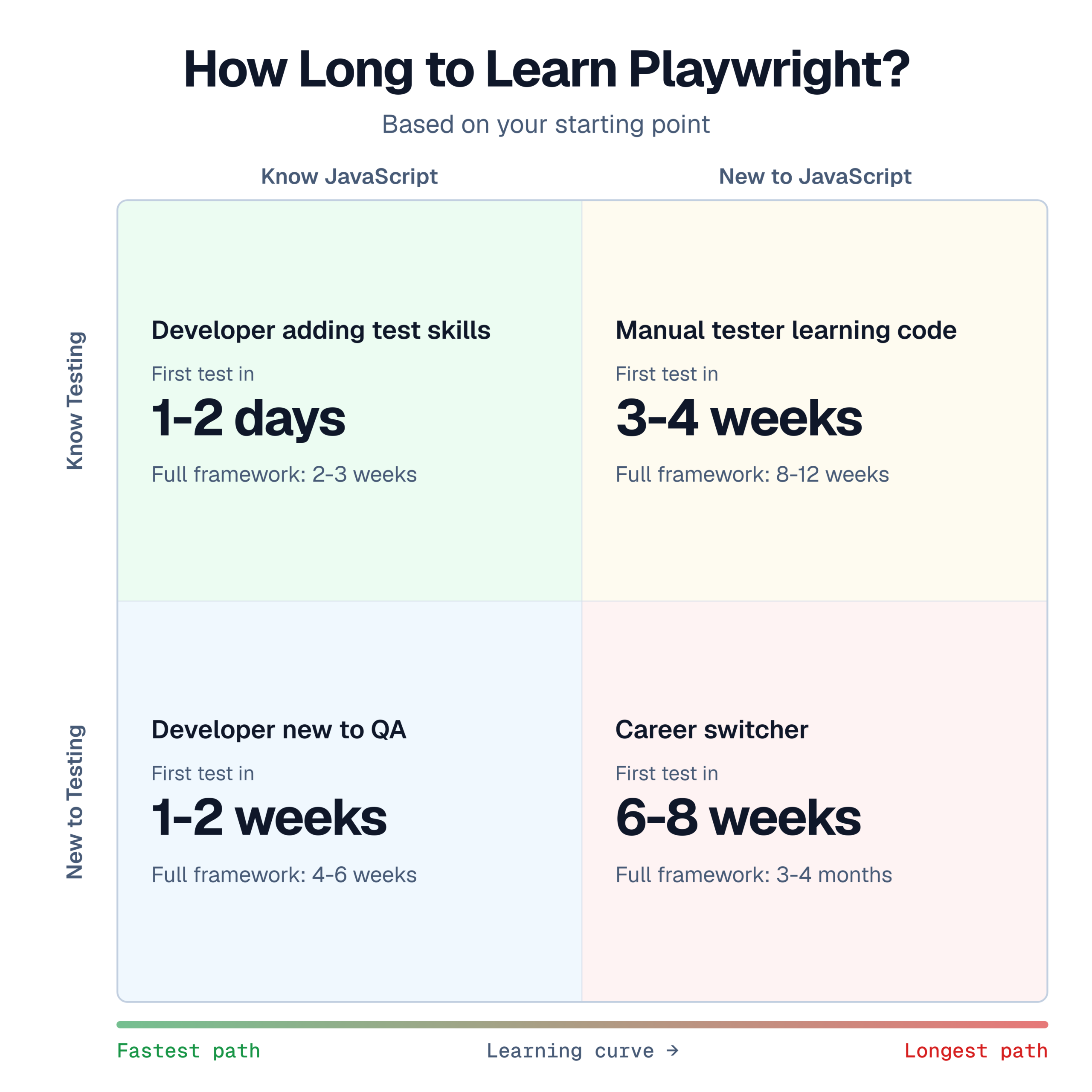 A developer with JavaScript experience can write and run basic Playwright tests within 1-2 days. Building a production-ready framework typically takes 2-4 weeks.