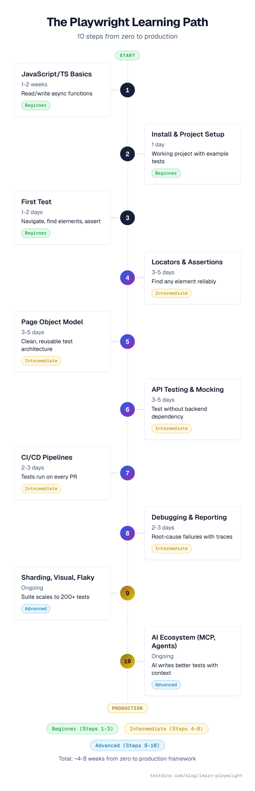 This guide is the 10-step sequence, from JavaScript basics to the AI ecosystem (MCP, test agents, skill packs) that shipped in 2025-2026.