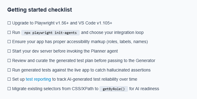 • npx playwright init-agents fails silently: This usually means you are running a Playwright version older than v1.56. Run npx playwright --version to confirm. If you are below 1.56, upgrade first with npm install -D @playwright/test@latest.