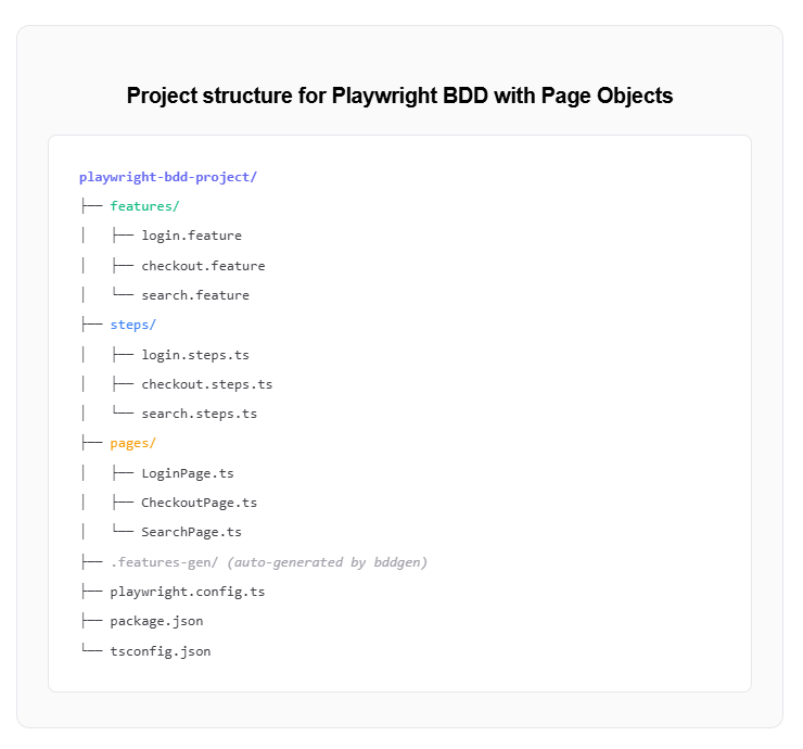 This section walks through the complete setup from an empty folder to a working Playwright BDD project using the playwright-bdd package and TypeScript.