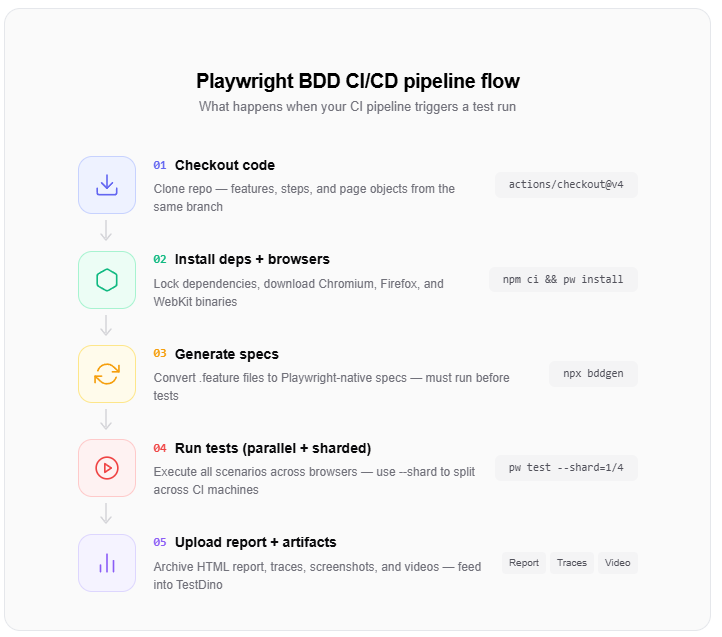 - Sharding for speed: For large BDD suites, split execution across multiple CI jobs: