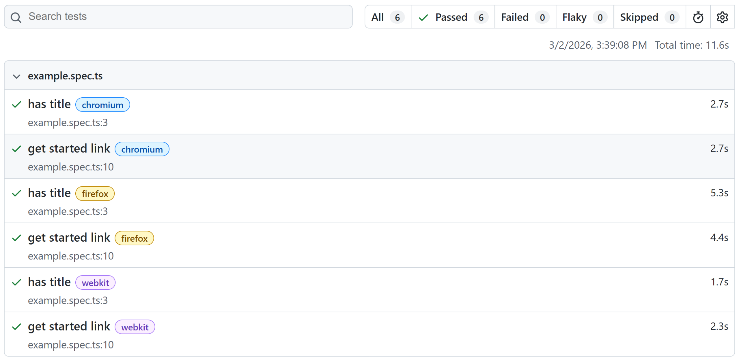 This test runs identically in Chromium, Firefox, and WebKit. No browser-specific code needed.