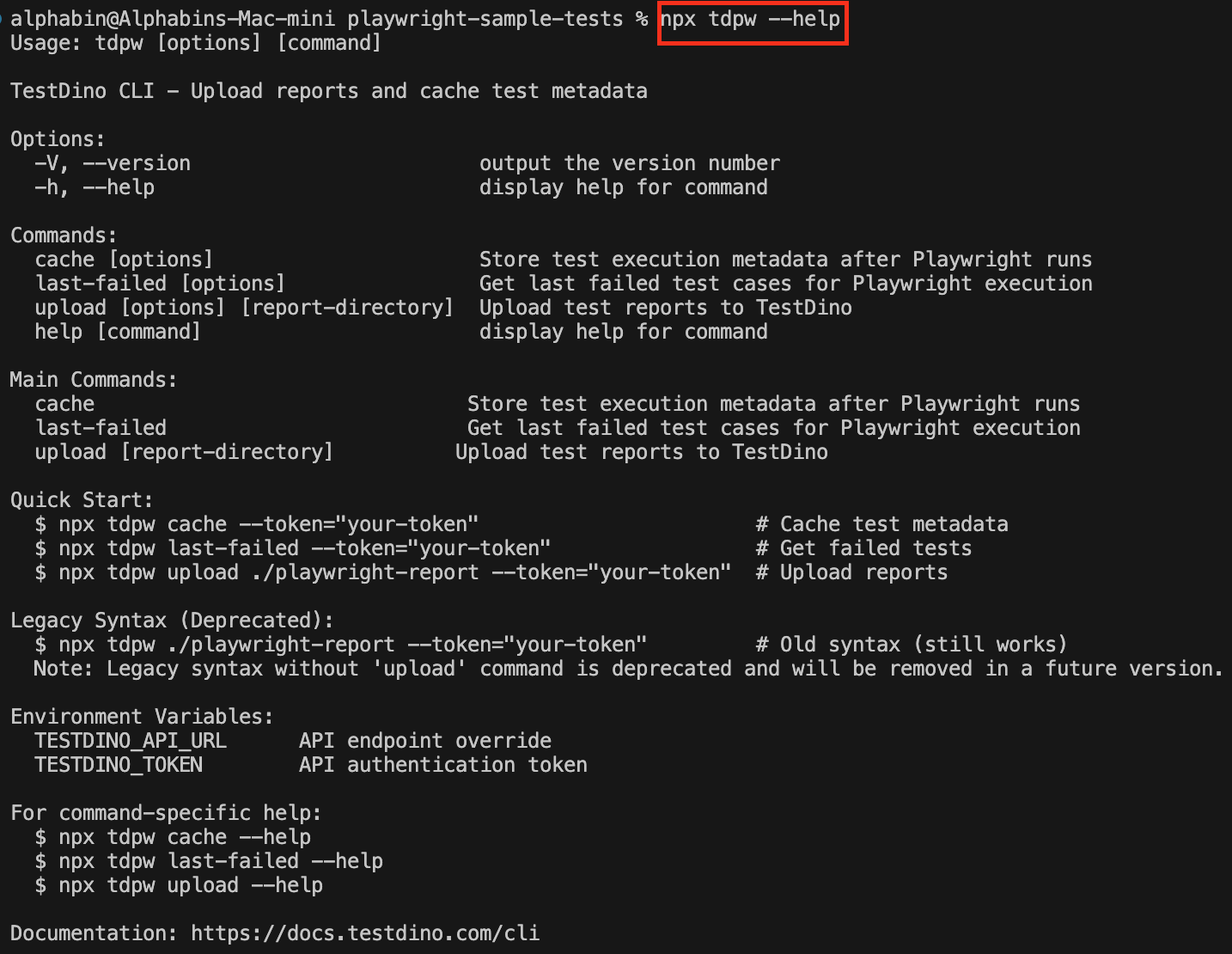 This command confirms the CLI is available and ready to upload Playwright reports.