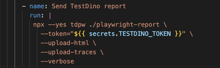 run: npx tdpw upload ./playwright-report --token="${{ secrets.TESTDINO_TOKEN }}" --upload-html