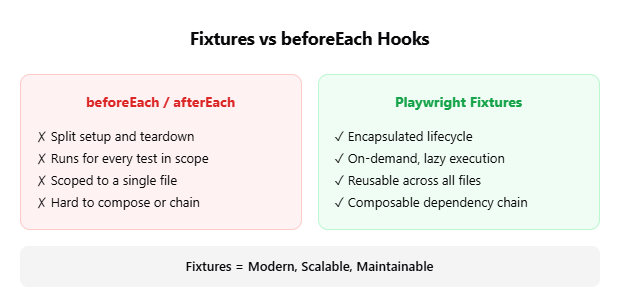 - On-demand execution: A beforeEach hook runs for every test in the file. Fixtures are lazy. If a test does not de-structure the fixture, it never executes. This matters when you have a file with 20 tests but only 3 need a database connection.
