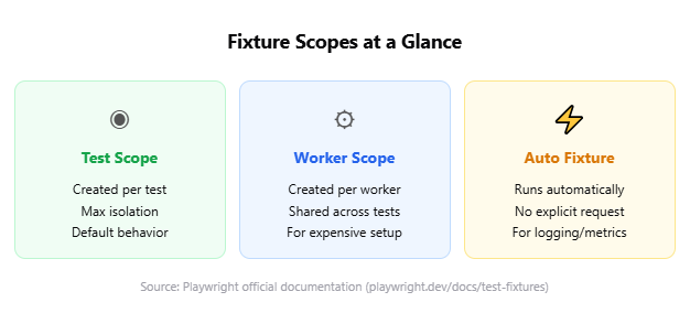 Tip: If your fixture consistently hits timeout, it is a signal to move it to worker scope. A 30-second setup that runs once per worker is far better than a 30-second setup multiplied by every test.