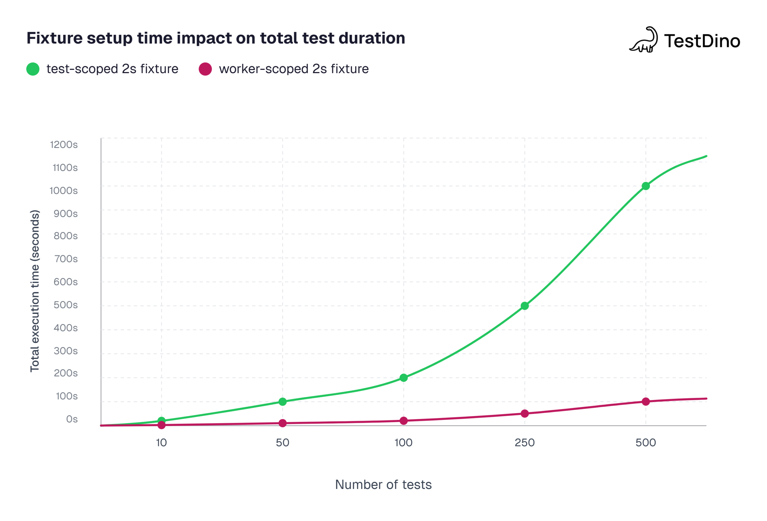 Source: Calculated based on a 2-second fixture setup with Playwright default parallelism (half CPU cores). Worker-scoped amortizes the 2s setup across all tests per worker.
