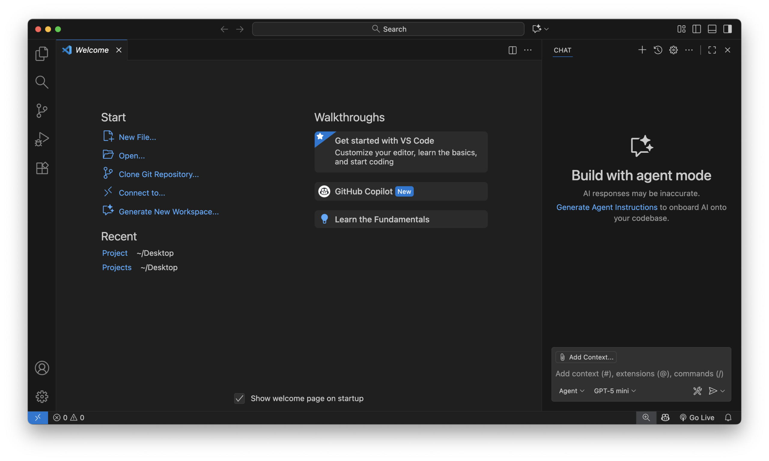 - Open Copilot chat by clicking the Copilot icon in your VS Code sidebar.