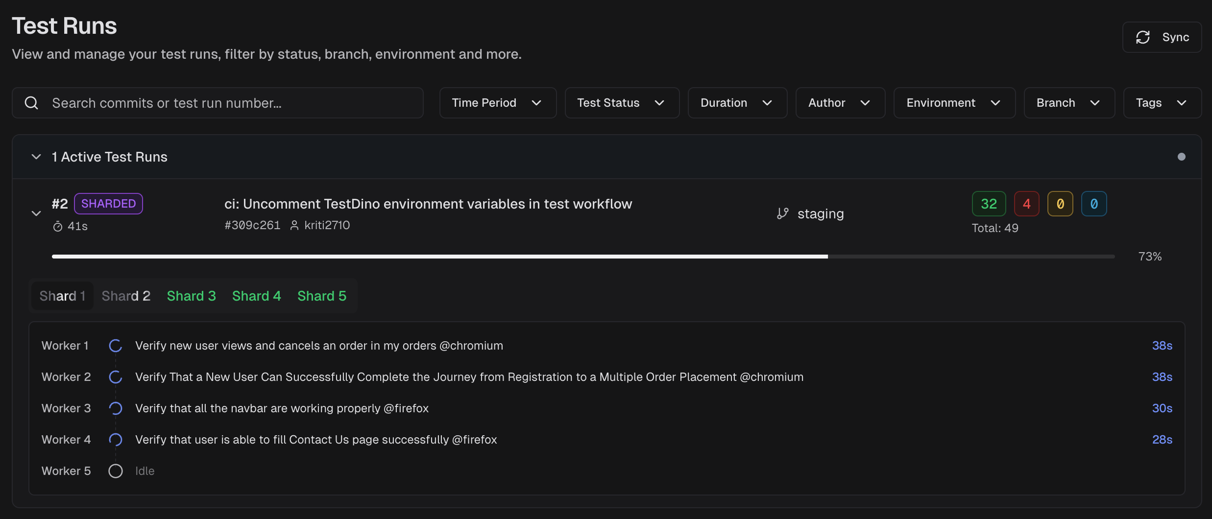 Tip: When running sharded tests across multiple CI machines, pass --ci-run-id to group all shards into a single run on the dashboard: