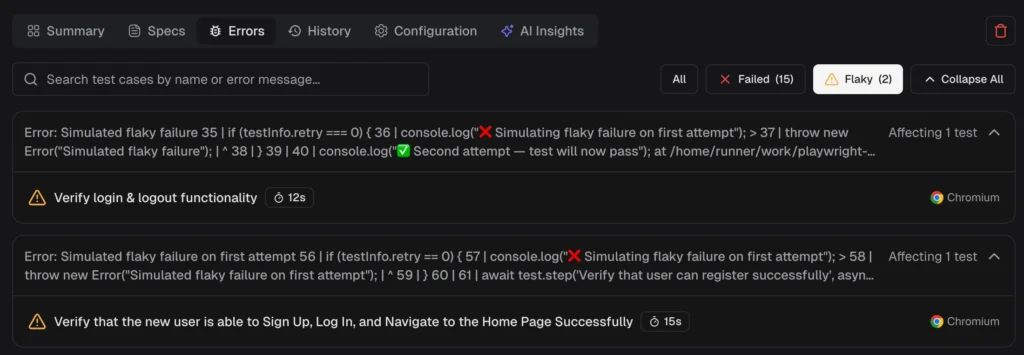 Within a single run: A test that fails initially but passes on retry is marked flaky immediately. This requires Playwright retries to be enabled.