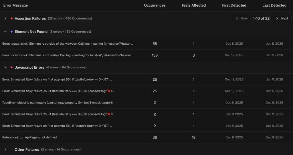 Failures with the same root cause are grouped. Instead of investigating 50 individual failures, your team fixes 3 root causes.