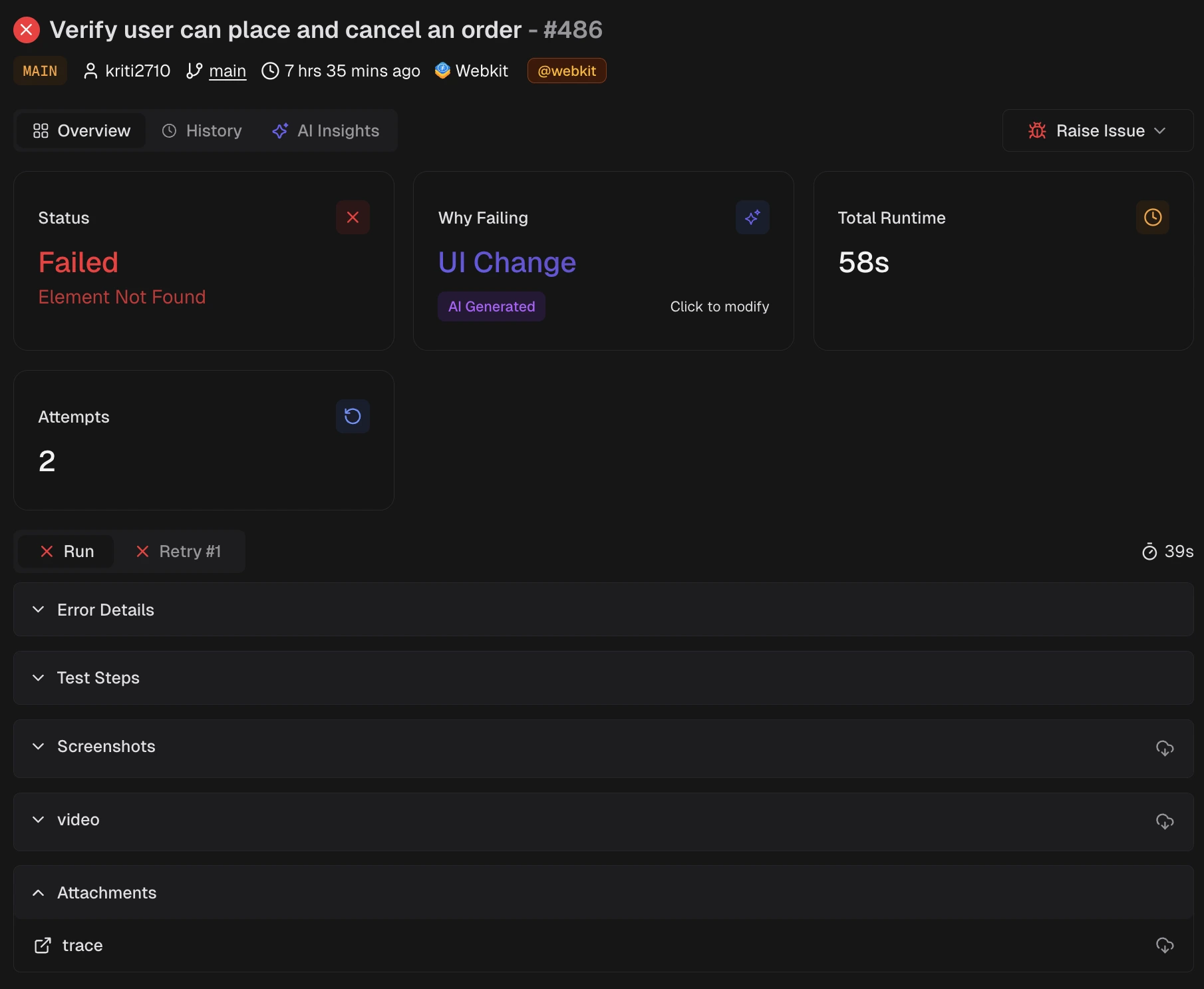 | UI Change | Selector or DOM change broke a test step | Update locators or flows |