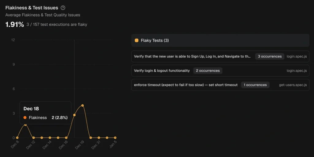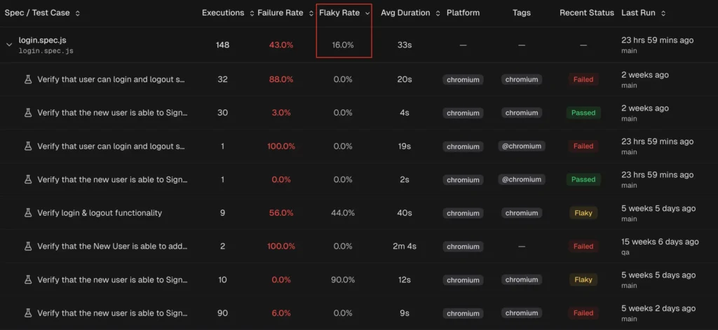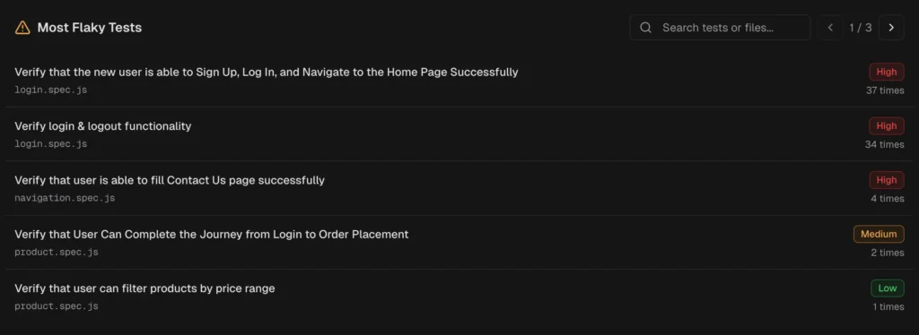 TestDino automatically detect flaky tests using both within-run and cross-run analysis and surfaces them in the QA dashboard, test explorer, and analytics.