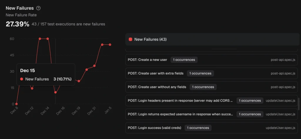 The platform also surfaces persistent failures (tests failing across multiple runs) and emerging failures (tests that started failing recently and are getting worse). This tells you where to look first.