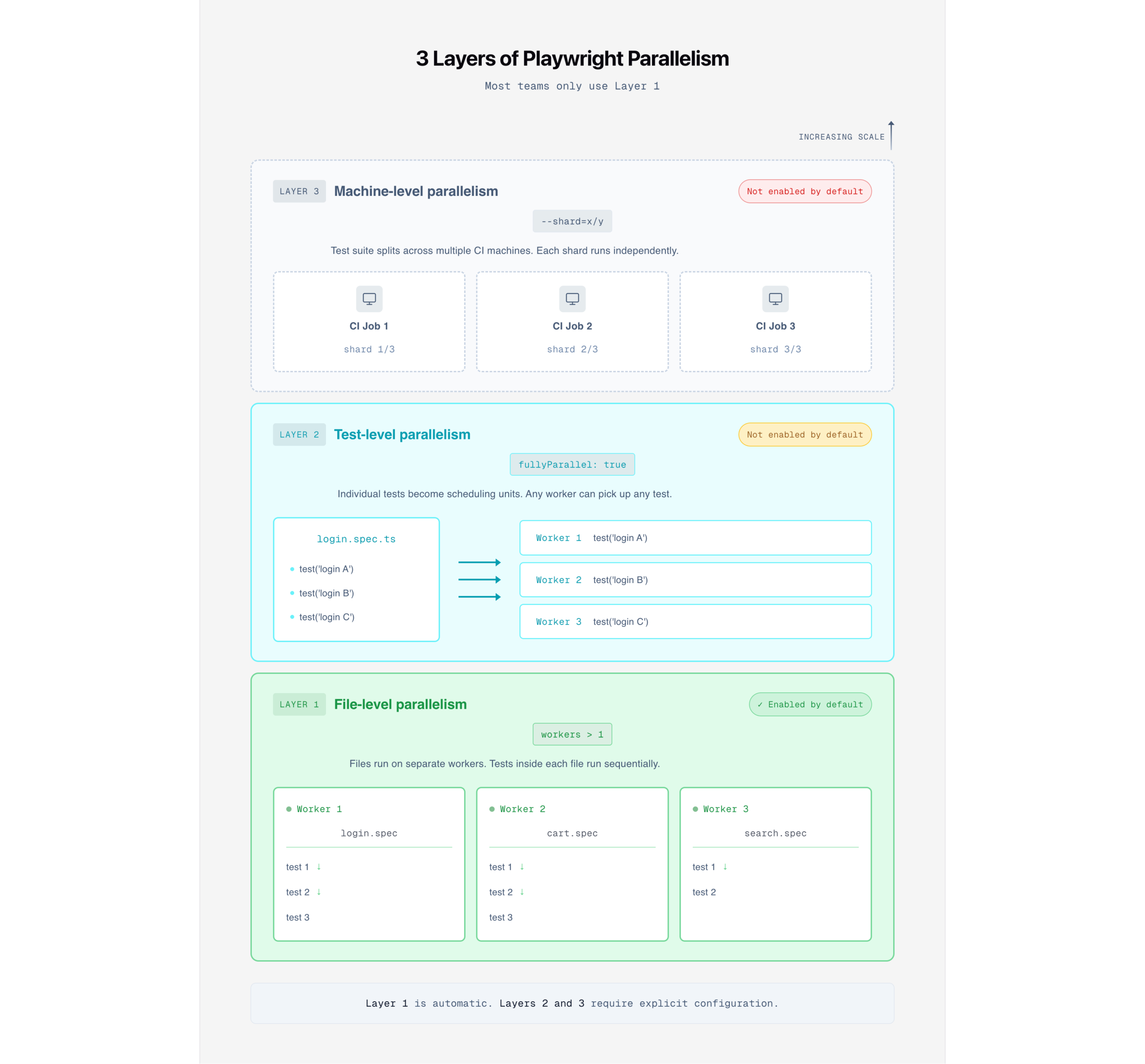 Layer 1 is already active. Layer 2 is what fullyParallel controls. Layer 3 is Playwright sharding, which we've covered separately.