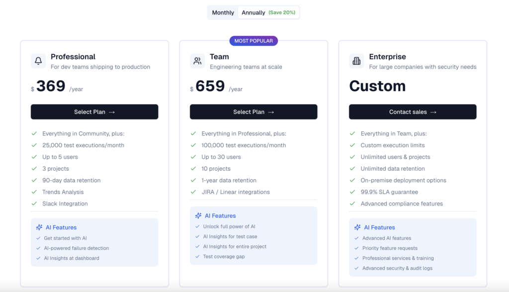 - Flaky test detection: identifies unstable tests over time instead of marking everything as "failed."