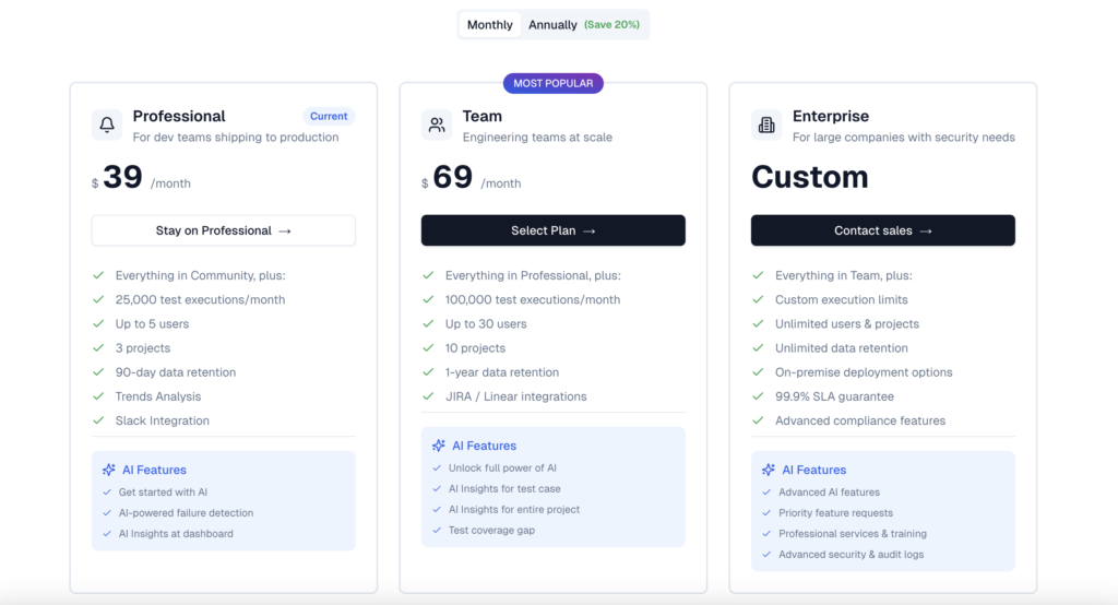 | Best For | Modern QA teams | Enterprise QA orgs | Playwright-first teams | QA + Test management | QA + Test management |