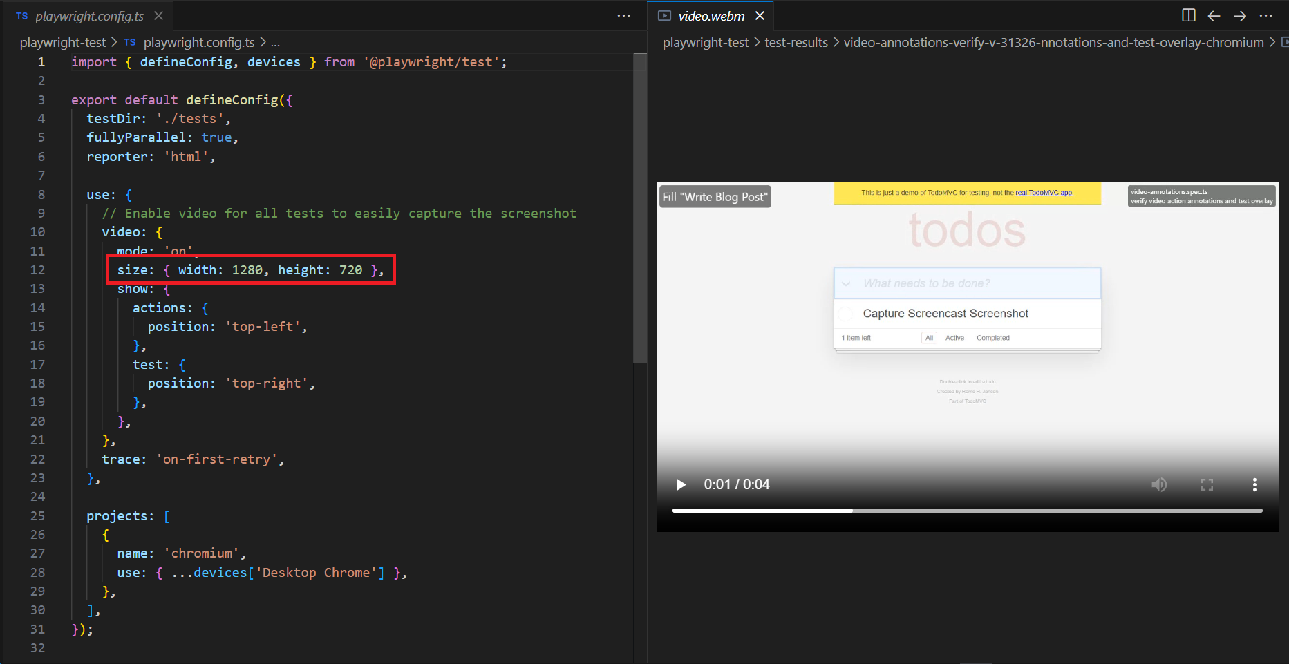 Starting with v1.59, you can pass an object instead of a string to control video dimensions and enable visual overlays directly from the config. The show property adds action annotations and test info overlays without writing any screencast API code.