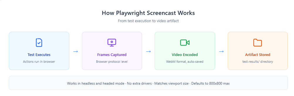 Playwright screencast is the built-in capability that records the browser viewport during test execution and saves it as a WebM video file. It captures frames directly from the browser rendering engine at the protocol level, which means it works identically in headless and headed modes, requires no external tools, and matches your test's actual viewport dimensions.