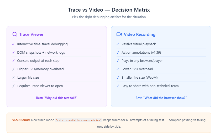 Use video when you need to confirm what happened visually : Layout shifts, animation glitches, unexpected pop-ups, and race conditions that cause elements to briefly flash on screen are all easier to spot in a video than in DOM snapshots. With v1.59 action annotations, Playwright screencast videos now carry significantly more context than raw recordings.