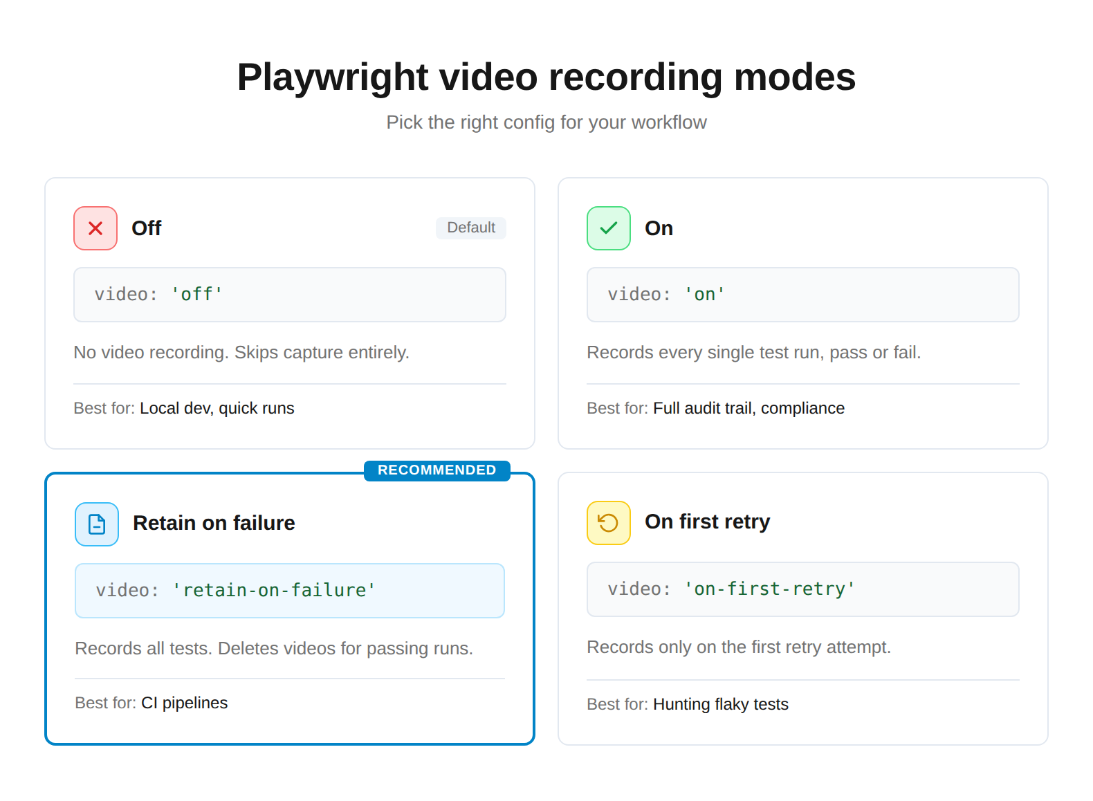 Playwright gives you four recording modes through the video option in your config. Each mode controls when test videos are captured and whether they are deleted afterward.