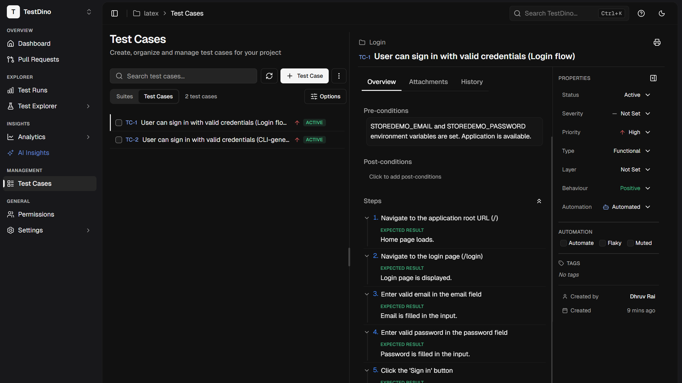 TestDino's Test Case Management tab is a standalone workspace where teams create, organize, and maintain all their manual and automated test cases within a project. As you generate tests with Goose, you can track them inside TestDino to keep your coverage organized.