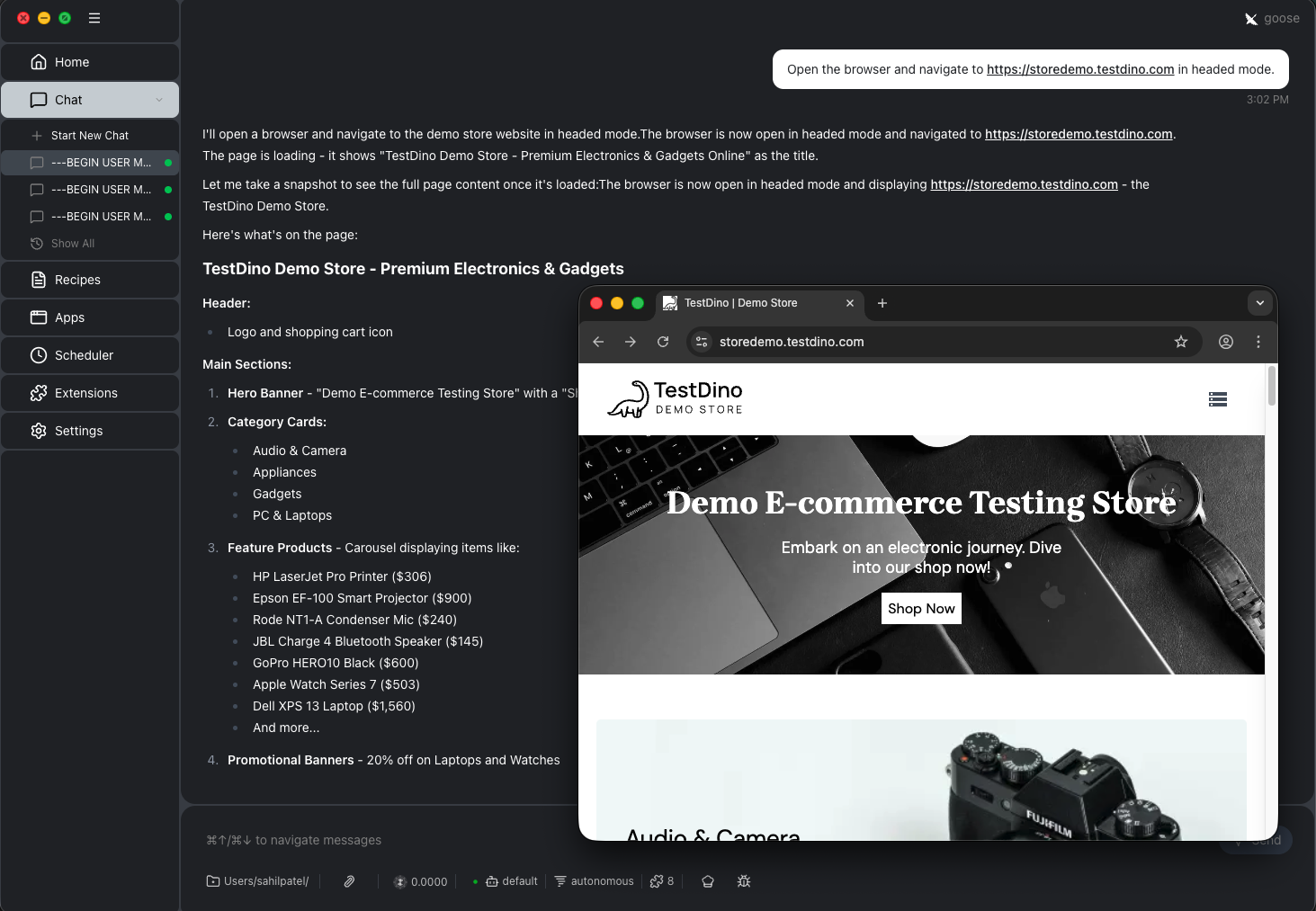 Tip: You can verify the MCP connection by asking the agent: "Open the browser and navigate to storedemo.cms.testdino.com ". If the agent launches a browser and returns a snapshot, the MCP is working correctly.