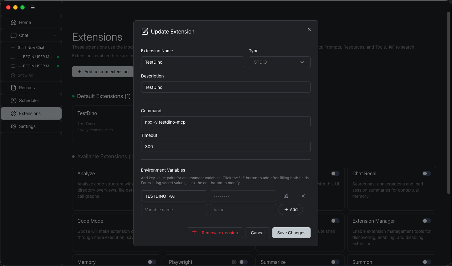 Click Save Changes to activate. Goose will load TestDino tools for querying tests, results, and more.