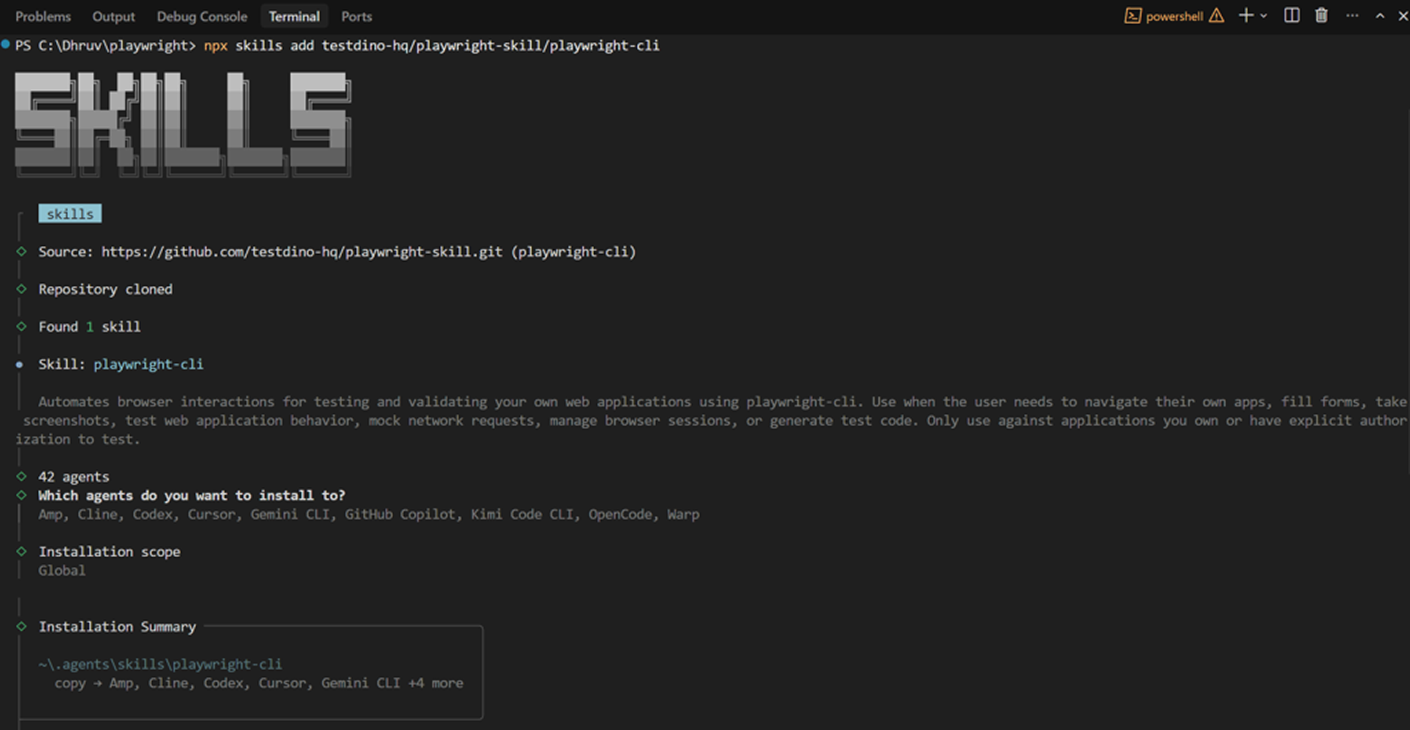 - Install playwright skills: npx skills add testdino-hq/playwright-skill/playwright-cli