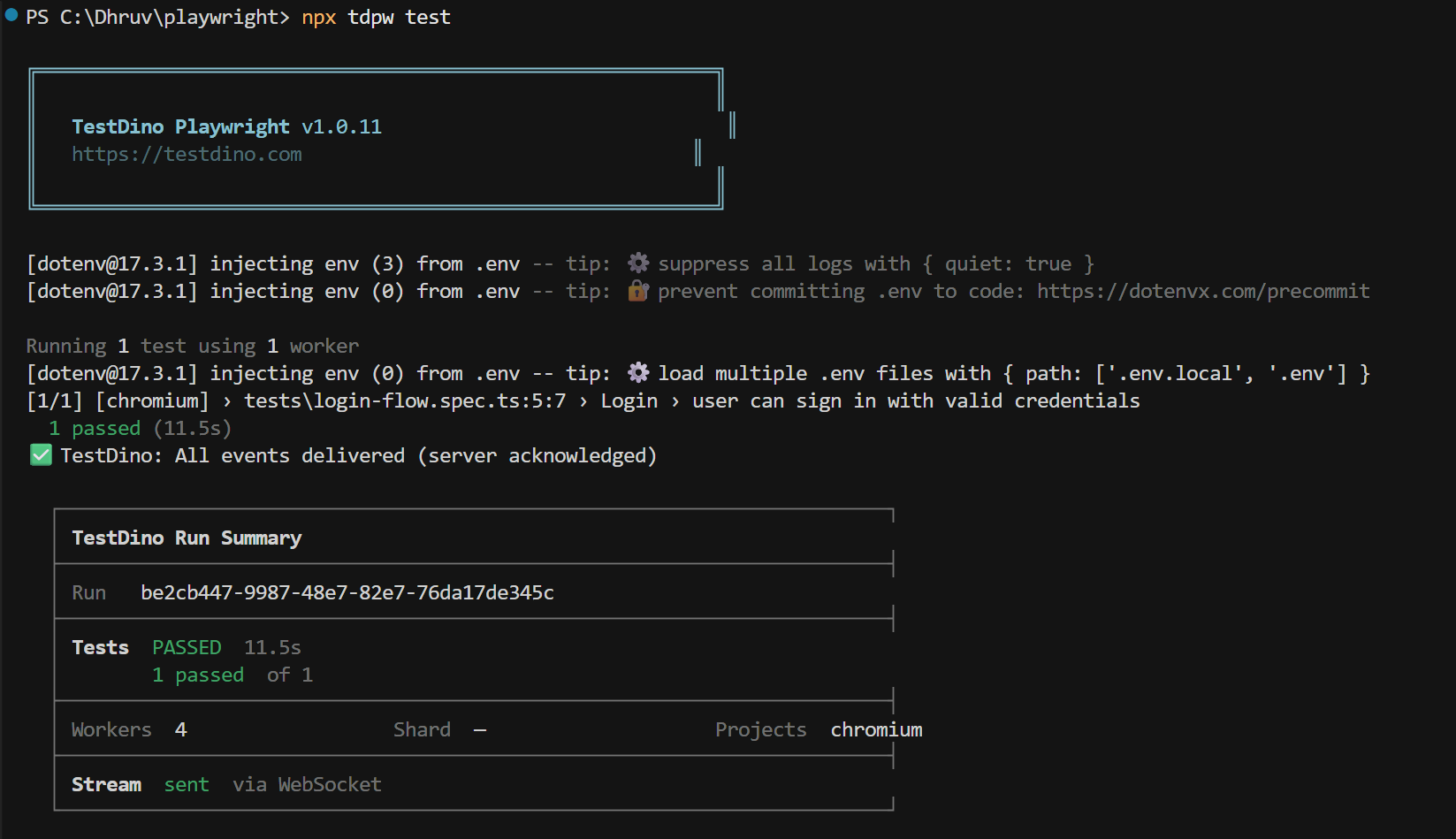 Every Playwright CLI flag works the same: --project, --grep, --workers, --shard, --headed. Nothing changes except results now stream to the TestDino dashboard in real time via WebSocket.
