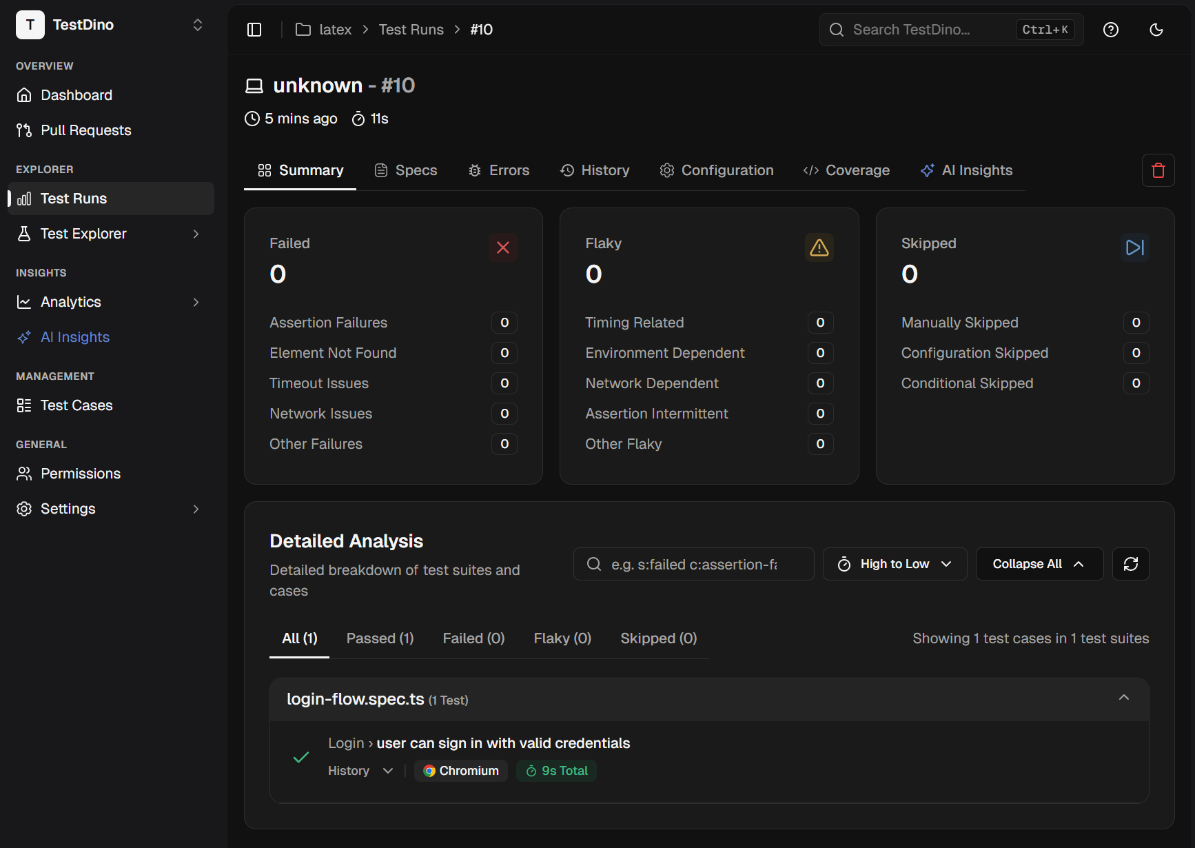 2. TestDino dashboard (full analysis): Results are sent to the TestDino web app with detailed insights, history, and failure classification.