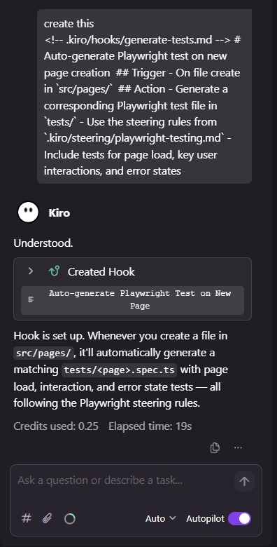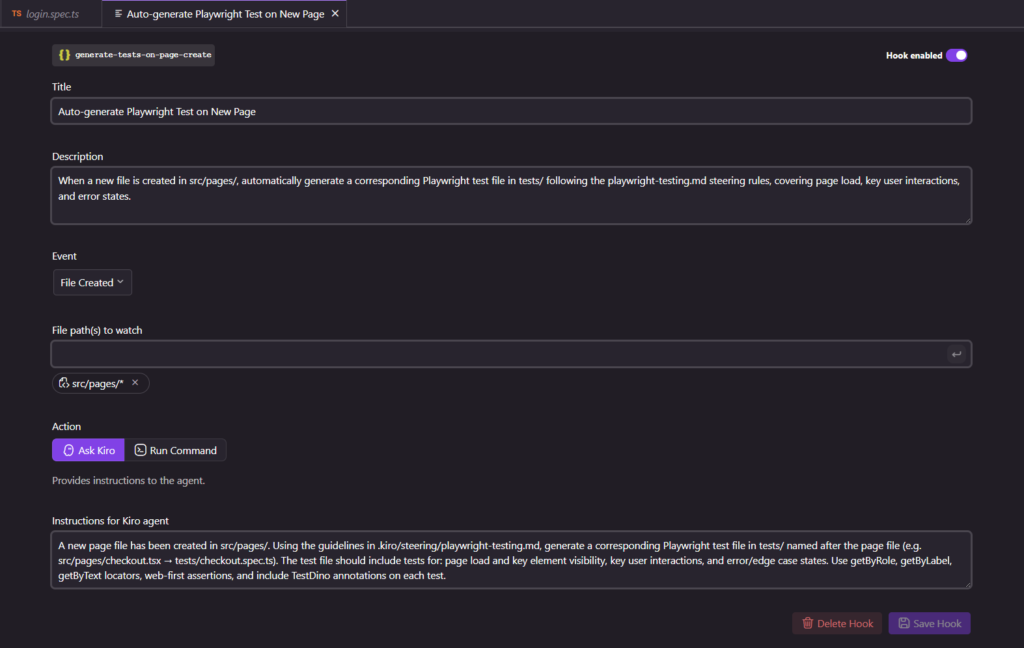 Kiro also ships with Agent Hooks, which are automated triggers that run on file events. Save a new page object file, and Kiro can automatically generate a corresponding test spec. That is not something you get with a standard chat-based AI.