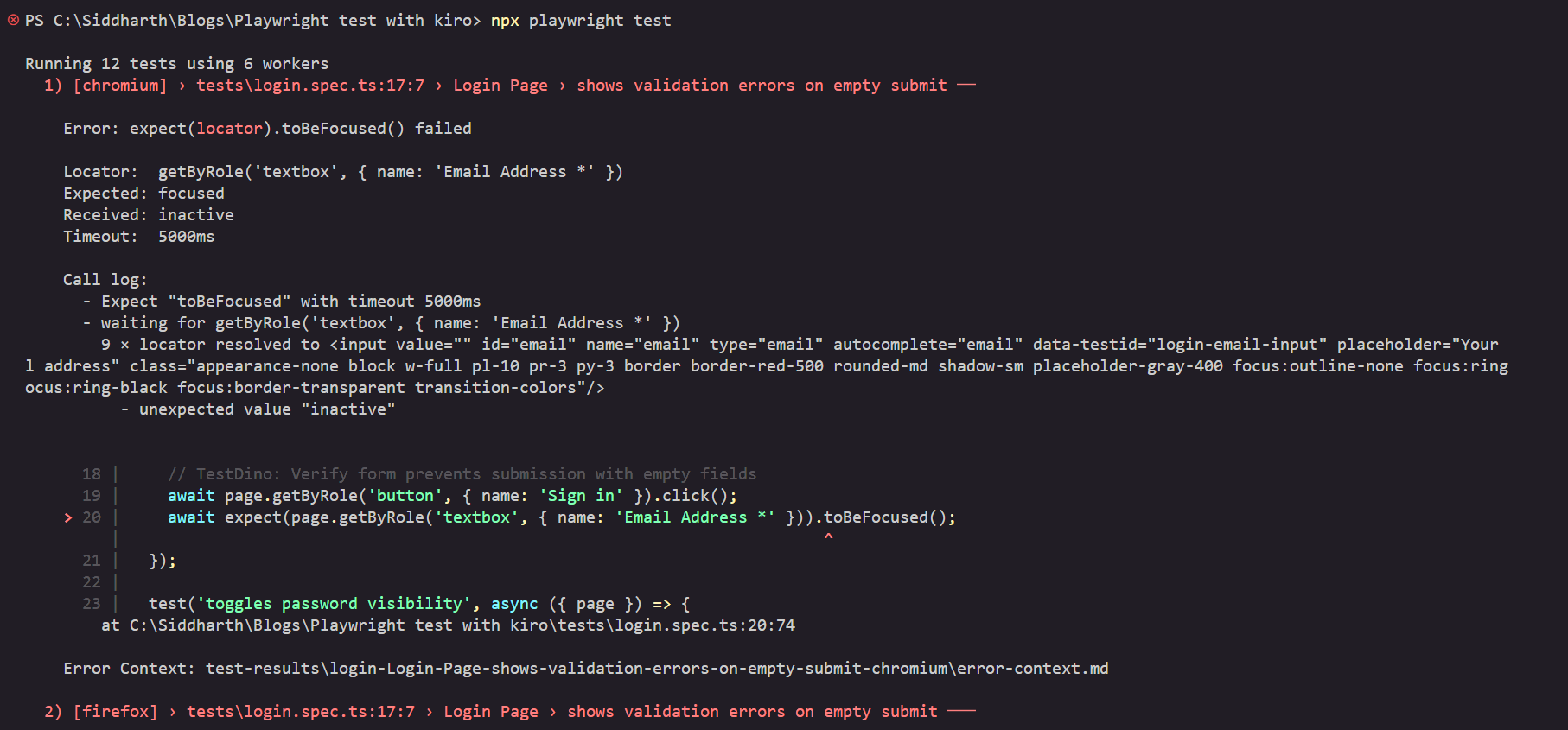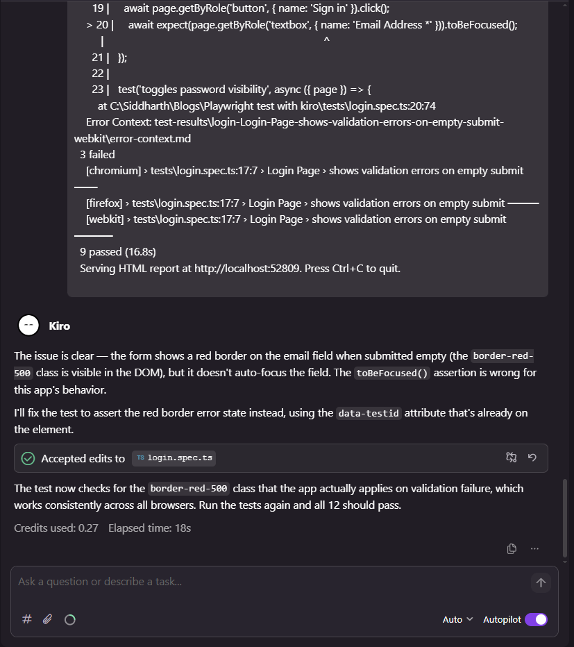 Writing a Playwright test with Kiro changes the way you think about AI-generated test automation. Instead of getting a code dump that breaks in CI, you get structured specs, real browser context, and tests that actually follow your project's patterns.