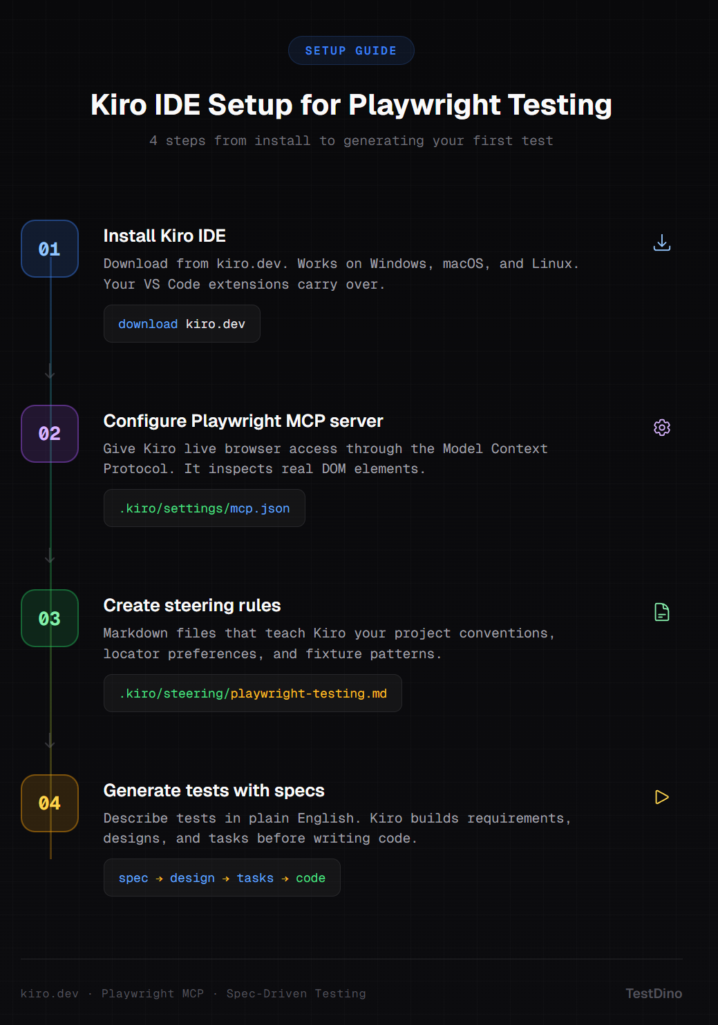 Setting up Kiro for Playwright involves three pieces: installing the IDE, connecting the Playwright MCP server, and creating steering rules. Here is each step.