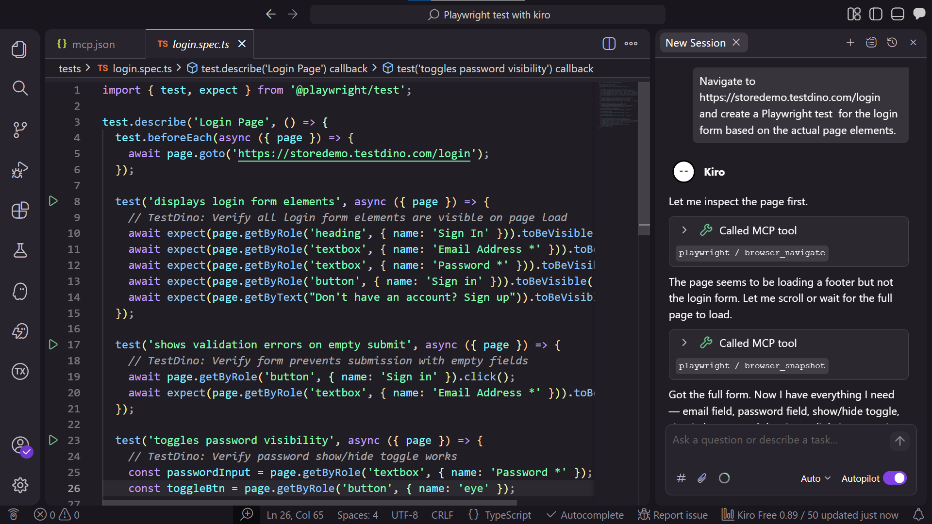 The other thing worth knowing is that Kiro supports MCP (Model Context Protocol) natively. This means it can connect to a real browser through the Playwright MCP server and generate tests based on the live DOM, not cached assumptions.