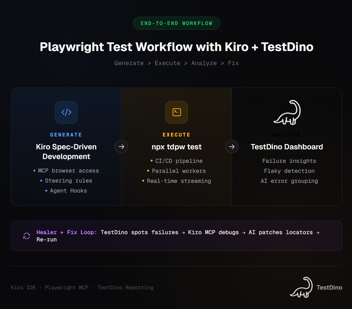 Struggling with AI-generated Playwright tests that break in CI? This guide walks you through setting up Kiro IDE with Playwright MCP, creating steering rules for spec-driven test generation, and running them with TestDino for real reporting and failure analysis.