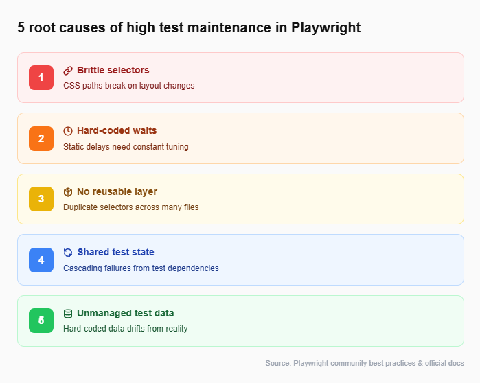 Before you can fix a problem, you need to name it. Test maintenance in Playwright typically spirals because of five overlapping issues. Here is each one, why it happens, and how it compounds over time.