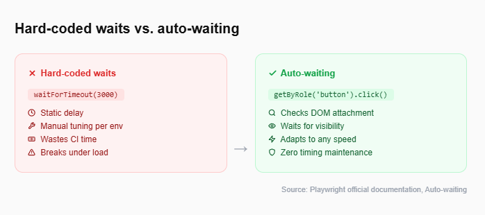 Hard-coded waits (page.waitForTimeout()) are one of the top contributors to flaky test behavior. Playwright's auto-waiting engine solves this without any extra code.