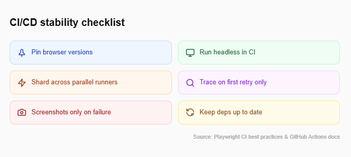 At this point, your tests have stable selectors, a clean abstraction layer, automatic waits, isolated state, and managed data. The last place maintenance hides is in your CI/CD pipeline.