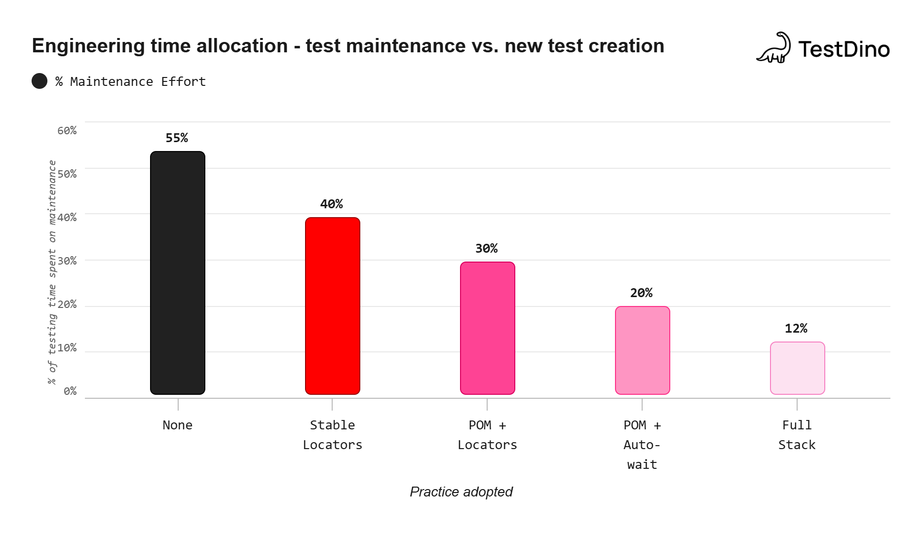 Each practice stacks on the previous one. Teams that adopt stable locators, POM, auto-waiting, test isolation, and CI optimization together have reported cutting maintenance time from over 50% down to roughly 12% of their total testing effort.
