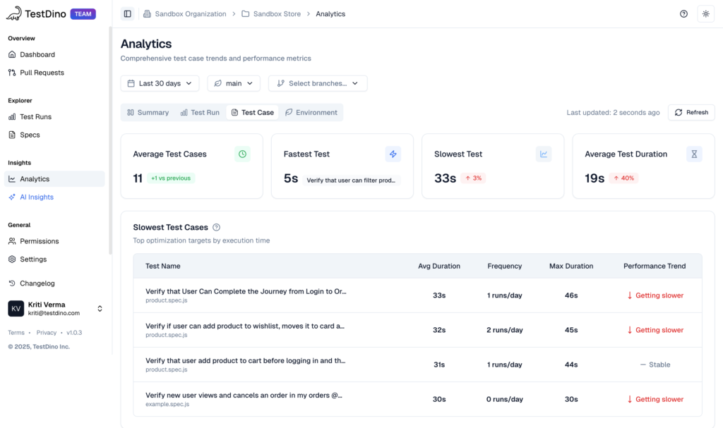 QA leads can instantly see whether flaky test rates spiked on staging or if test speeds dipped last week