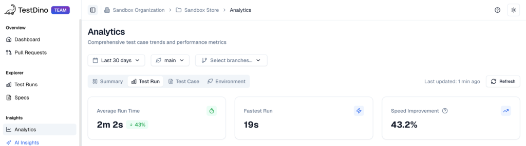 Run context at a glance: See Latest Test Run ID, start time, duration, pass/fail/flaky/skipped metrics, with AI-generated insights and root cause analysis.