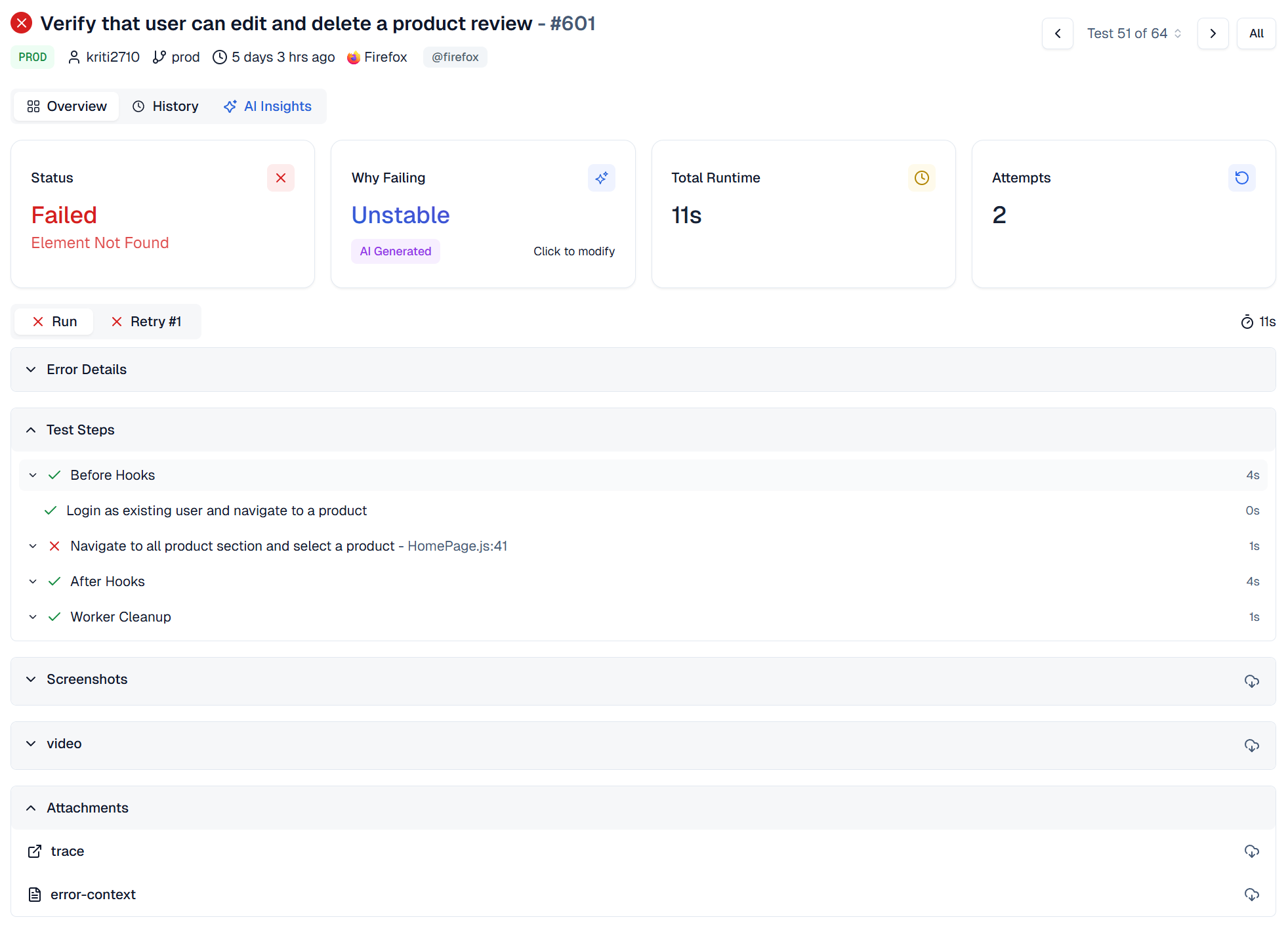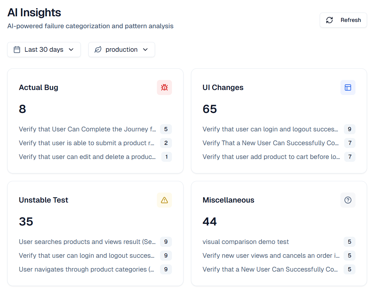 AI failure classification. When a test fails, TestDino automatically sorts it into buckets: infrastructure issue, code bug, or flaky test. Instead of spending 20 minutes reading logs, you know where to look in seconds.