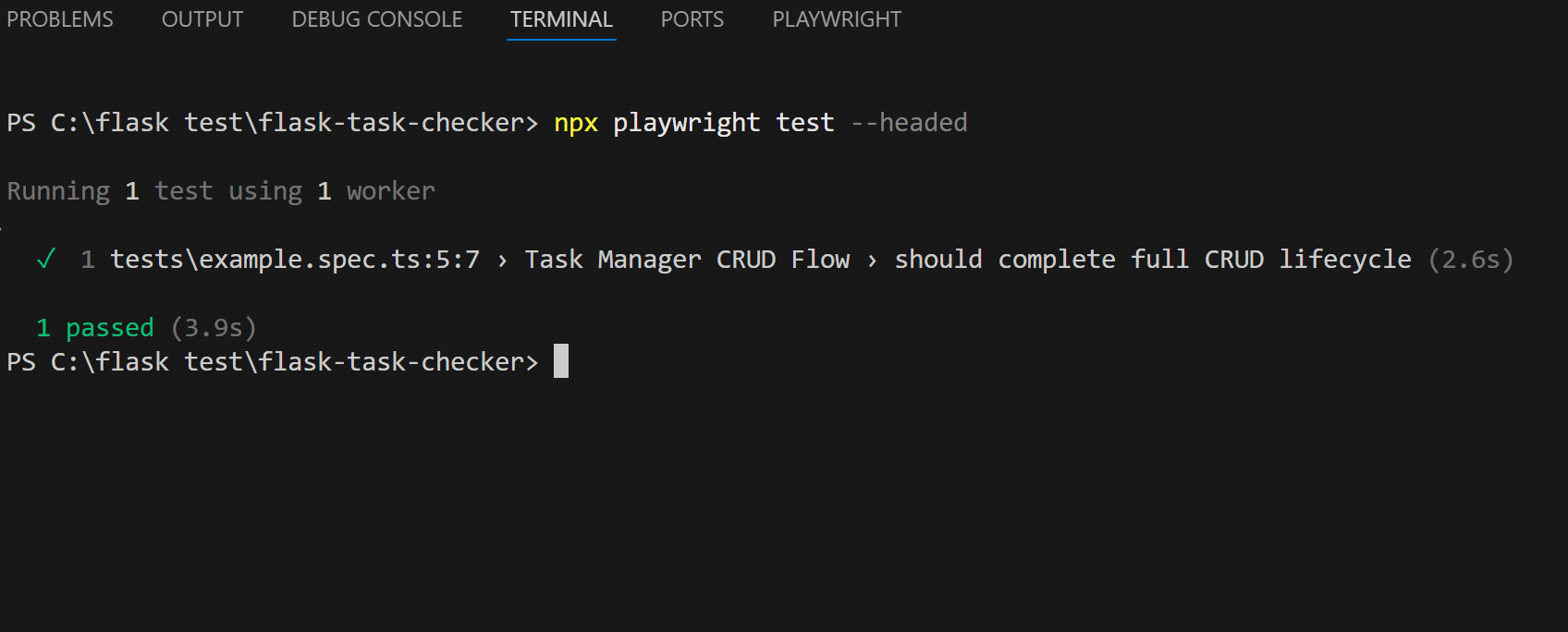 Important: If your Flask server is not running, then Playwright can't run the test. Always verify that your app.py is running before running Playwright tests. This is the #1 cause of "all tests failing" for beginners.